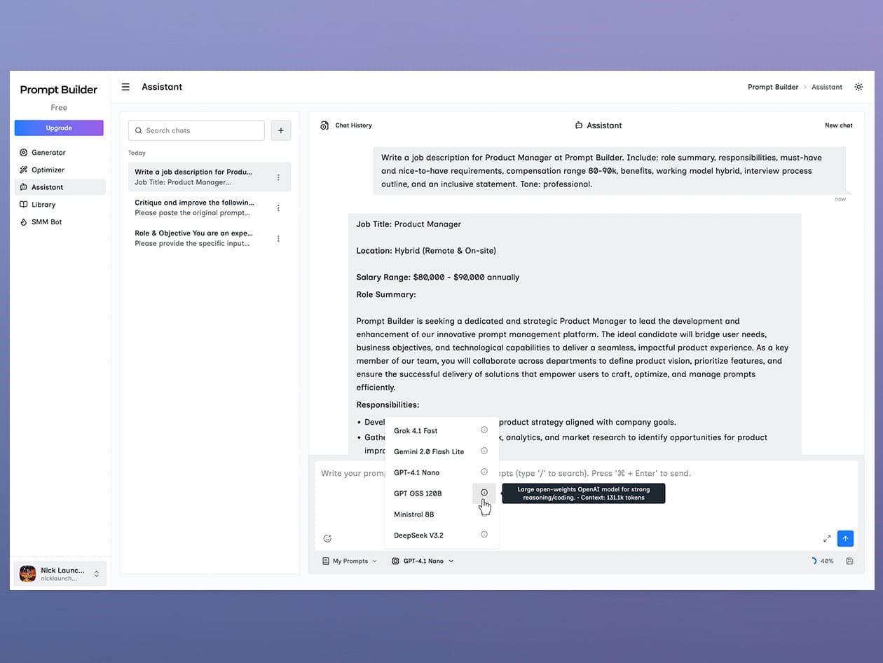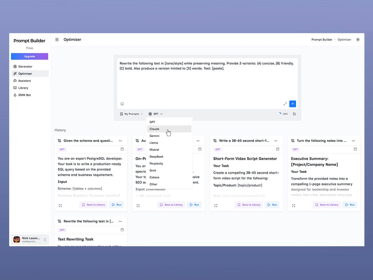 • Prompt Library: Store, tag, and organize your best-performing prompts for quick access.