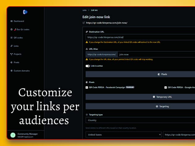 QR codes are a simple, efficient way to connect with your customers in a world that’s increasingly digital. If you want more engaged customers and more conversions, you need to make it easy for them to interact with your brand. That’s where PERSA comes in. PERSA provides industry-best QR code generation—simply, universally, and affordably. You can easily create dynamic, trackable, and customizable QR codes using our platform.