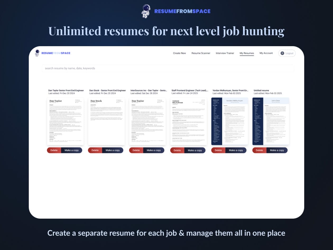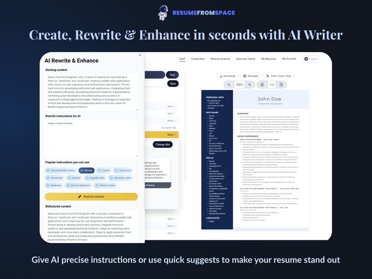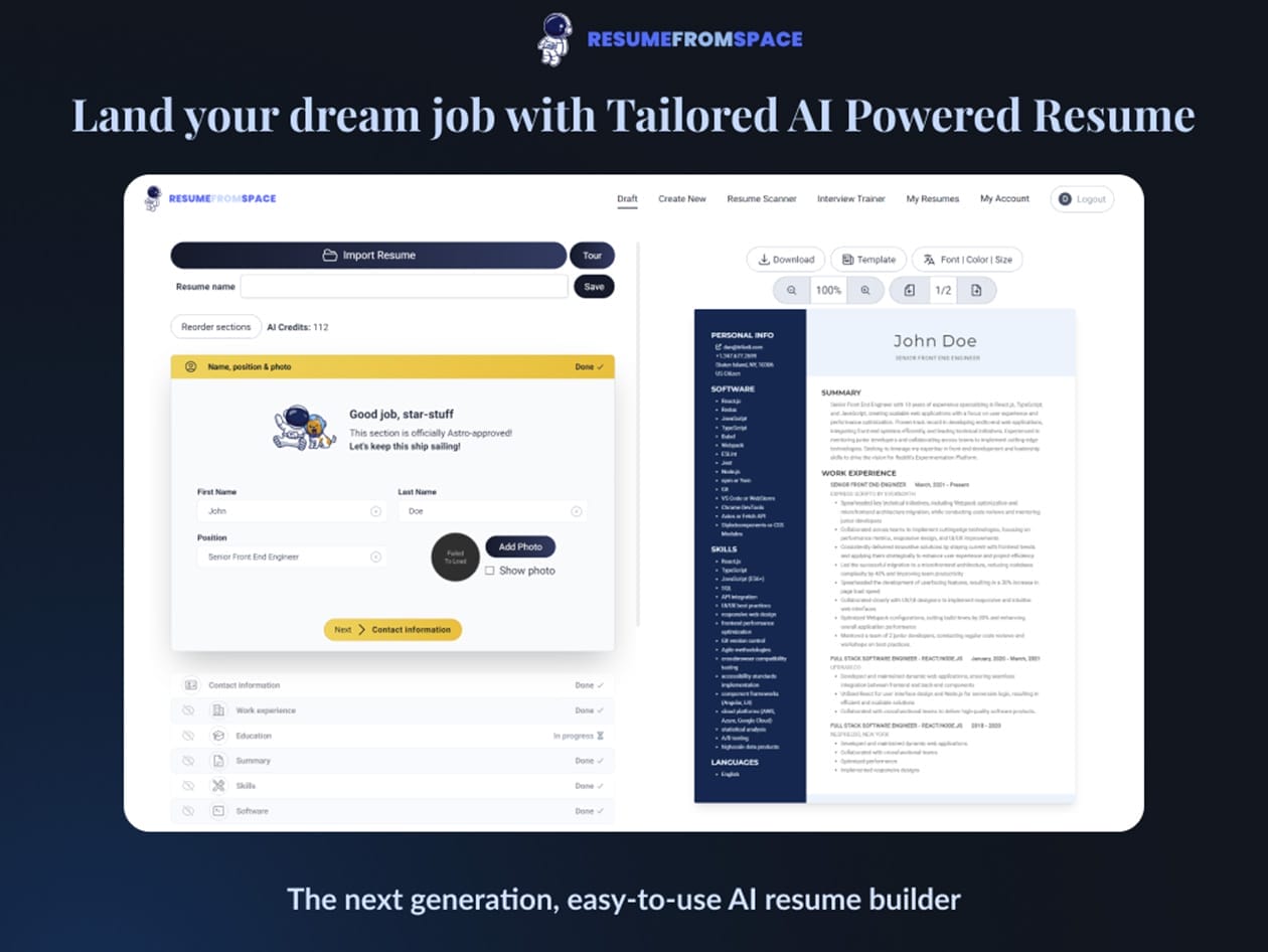 Struggling to stand out? ResumeFromSpace uses AI to craft a polished, professional resume that gets noticed. Whether you’re a recent graduate or a seasoned professional, this smart resume builder optimizes your content, formats it perfectly, and helps you highlight your strengths. With customizable templates, keyword optimization, and real-time AI suggestions, you’ll create a resume that impresses recruiters and gets past applicant tracking systems. Take the stress out of job applications and launch your career to new heights with ResumeFromSpace!