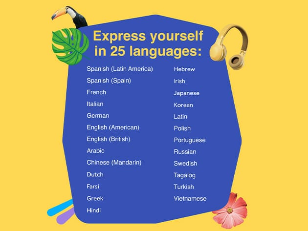 • Language: Spanish (Latin America), French, Italian, German, English (American), Arabic, Chinese (Mandarin), Dutch, English (British), Filipino, Greek, Hebrew, Hindi, Irish, Japanese, Korean, Persian (Farsi), Polish, Portuguese (Brazil), Russian, Spanish (Spain), Swedish, Turkish, Vietnamese