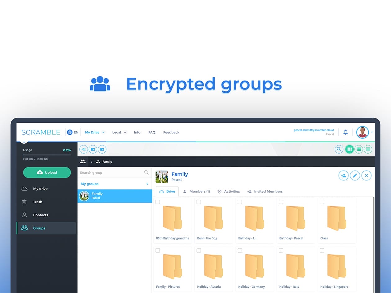 Groups: Create groups with friends, colleagues, or family members and share all your files securely with one click. You can set file permissions to manage access – a Scramble account is required for all participants.