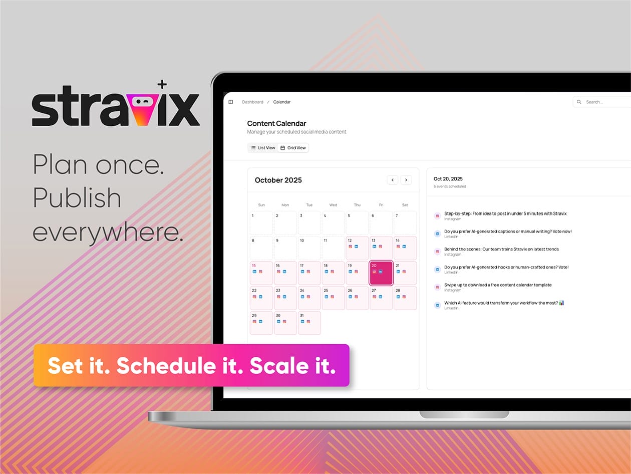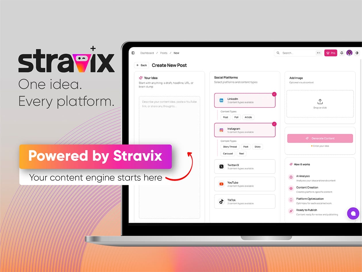 Stravix is a single workspace that learns your voice, plans the next 7 to 30 days, writes for each channel, includes images, and lets you edit in place. No prompt walls. Light instruction when you need it.