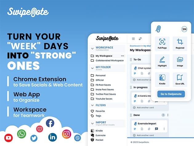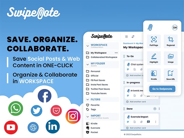 SwipeNote is the ultimate digital organization and collaboration tool that seamlessly integrates web content management and project coordination. With its powerful Chrome extension, you can save social media posts, capture screenshots, and bookmark URLs with a single click. The intuitive web app then allows you to organize saved content into unlimited folders, manage projects with task assignments, deadlines, and reminders, and collaborate with your team using real-time chat and task tracking. Whether you’re organizing personal content or working with a team, SwipeNote provides a comprehensive platform to streamline your workflow, enhance productivity, and ensure success.