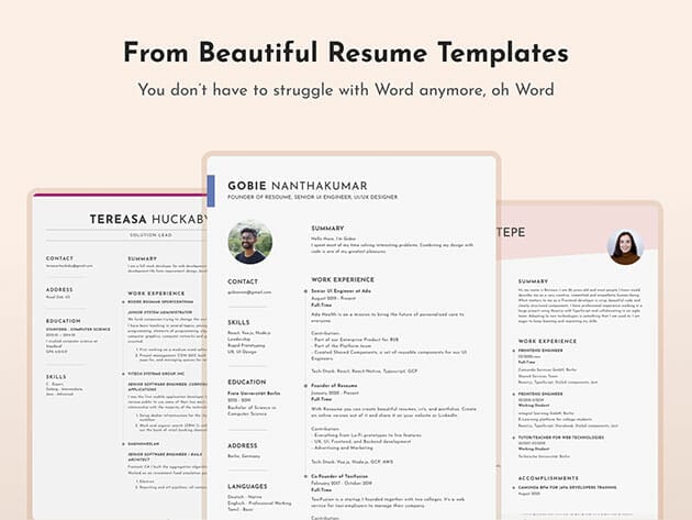 Resoume is an easy-to-use resume, portfolio, and cover letter builder that helps you create beautifully designed, ATS-ready documents that let your skills shine. Are you worried that your resume will be rejected by an ATS because of the format, or that your portfolio won’t stand out from the pile? Put your fears to rest and get Resoume.