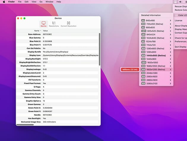 Display Maestro gives you full control over attached displays, allowing the use of all available resolutions and bit depths. Latest versions of macOS strip out the useful ability to set specific resolutions and presents a more user-friendly approach. Experienced users, especially graphic designers and presenters, demand more precise control of their devices. Access exactly the resolution you need with Display Maestro’s traditional Mac-like menu!