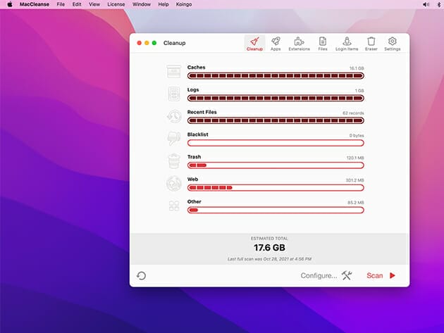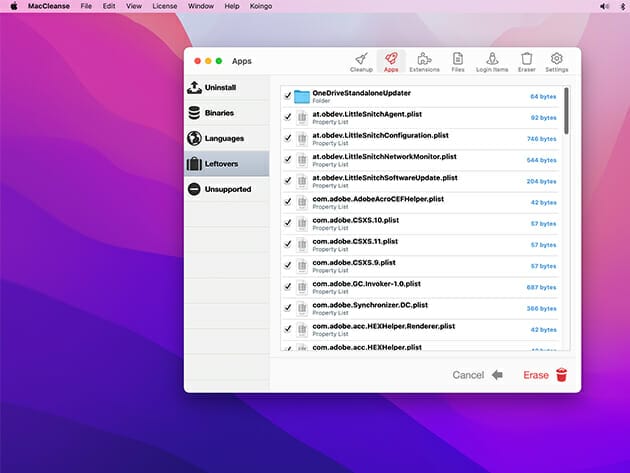 Keep your computer organized with MacCleanse, the premier file cleanup system for Mac. MacCleanse is a powerful application geared towards purifying your system and reclaiming hard disk space. In only seconds, it can perform over fifty tasks which could take hours to perform manually. Safely uninstall applications, slim Universal Binaries, wipe unused language files, erase caches, empty logs, clear cookies, delete web histories, locate unused and old files, and more. MacCleanse won’t miss a thing and could reclaim hundreds of megabytes, if not gigabytes, of storage.