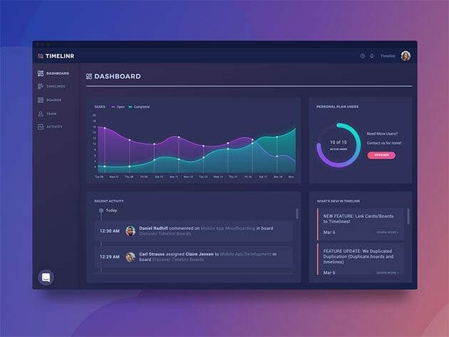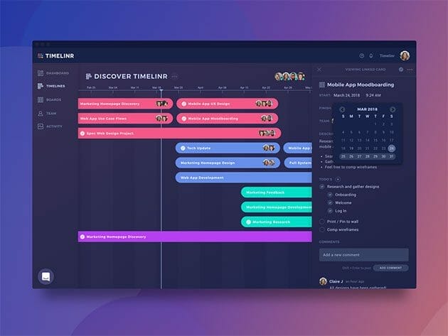 You might have a clear idea of where you want to go with your project, but a lot can happen between point A and B. Timelinr is the project planning app that lets you create high-level roadmaps in seconds, ensuring your stakeholders, team, and clients stay in the loop every step of the way. Whether you’re spearheading a new product launch or tasking it out to other coworkers, Timelinr keeps you in control with a unique look into your tasks and responsibilities at both the high and granular levels.