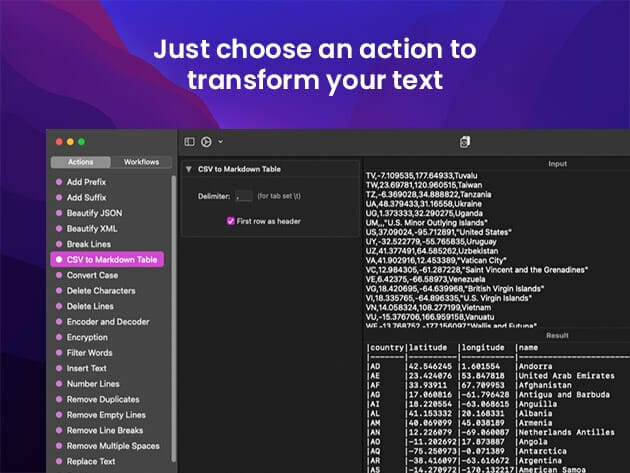 A powerful and easy-to-use tool that will help you transform your text. Text Workflow removes the need to perform repetitive tasks manually on your text. Combine transformation actions to create powerful automations for your text. Save your transformation workflows to use them any time want.
