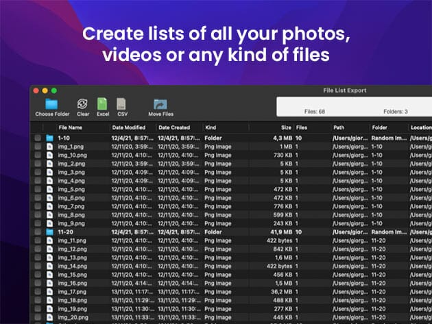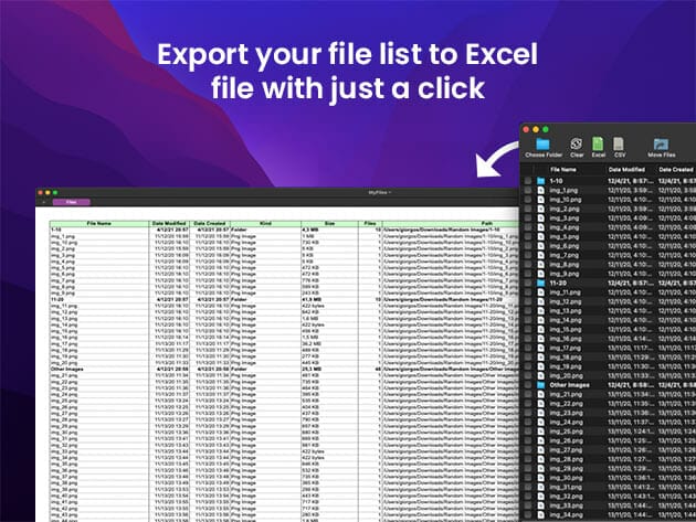 Export to Excel or CSV file. Export your list of files to xls or xlsx for further processing with Microsoft Excel or Numbers