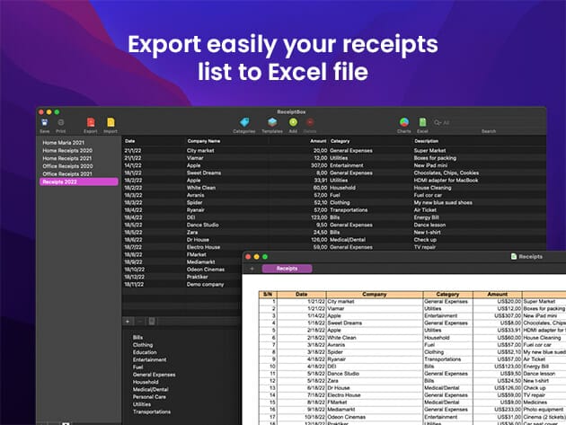Save and organize your receipts into multiple accounts with just a few mouse clicks. Additionally, you can group your expenses into different user-definable categories and view how much money you spend in any given category. Use personalized templates using exiting receipts in order to reduce data entry to a minimum and improve your productivity.