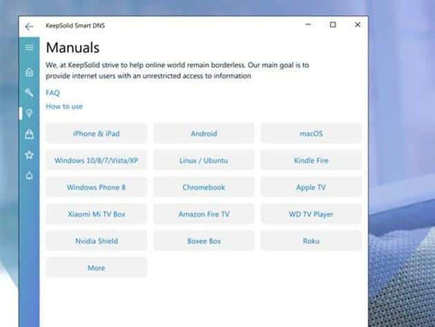 Enjoy your favorite video streaming services without any geo-restrictions with KeepSolid SmartDNS. Thanks to the freedomizer tool, your DNS queries will be re-routed, hiding your real location absolutely from any unauthorized third-parties. As a result, you can easily bypass any geo-restrictions and watch your favorite movies and TV shows in full-HD quality wherever you are. To top it off, the app can be used on any internet-capable device, and the number of available devices isn’t limited at all! You can download KeepSolid SmartDNS on iOS or Android or manually configure it for any device you need.