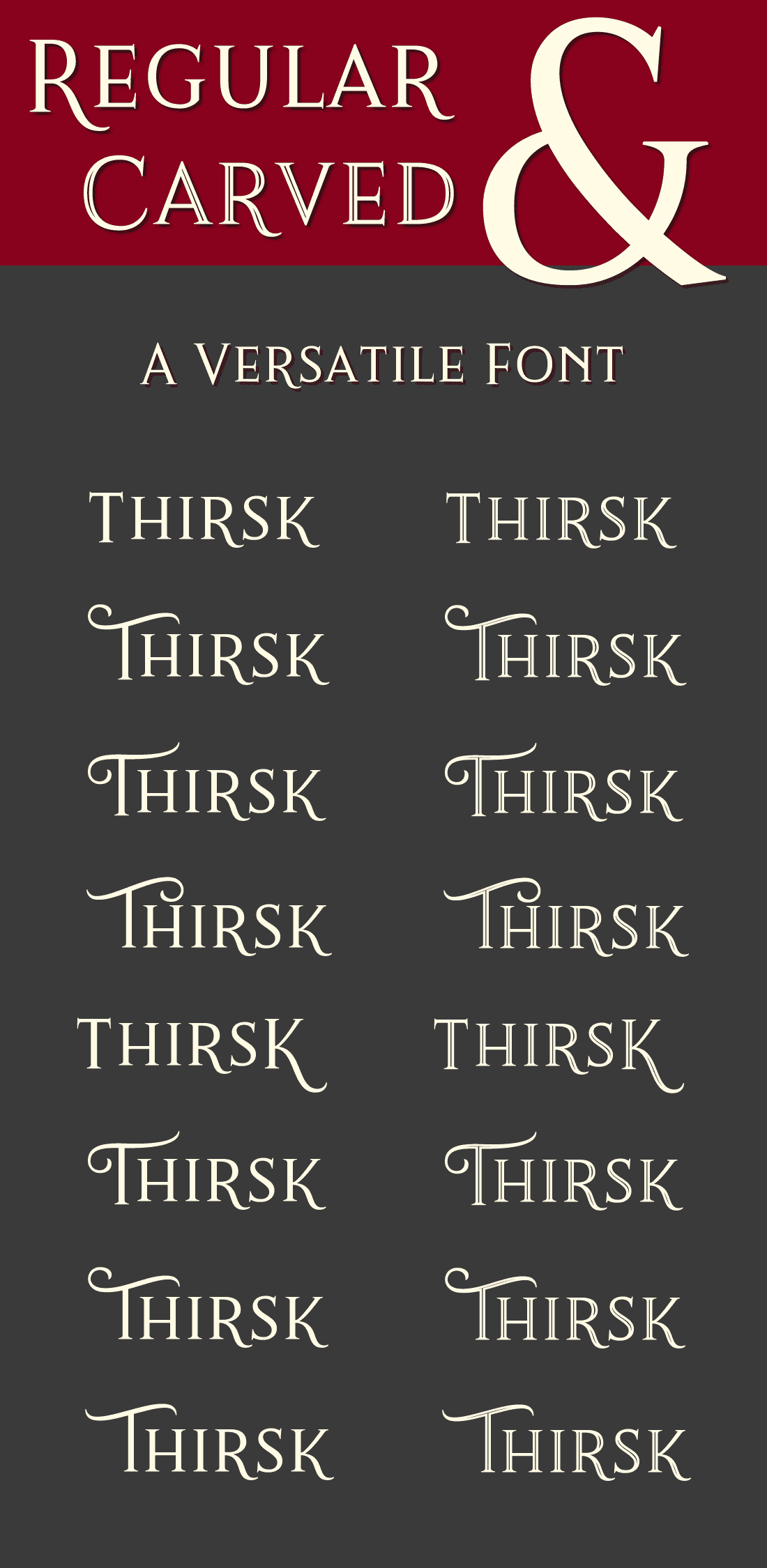 Typeface features 2 versatile fonts – Thirsk and Thirsk Carved.