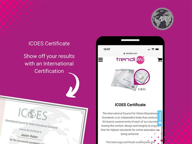 3. ICOES Certificate. The International Council for Online Educational Standards is an independent body that conducts third-party assessments of each of our courses, testing the content, design, and integrity to ensure that the highest standards for online education are being achieved. This hard copy certificate underscores the educational value of your course to employers, colleagues, and customers.