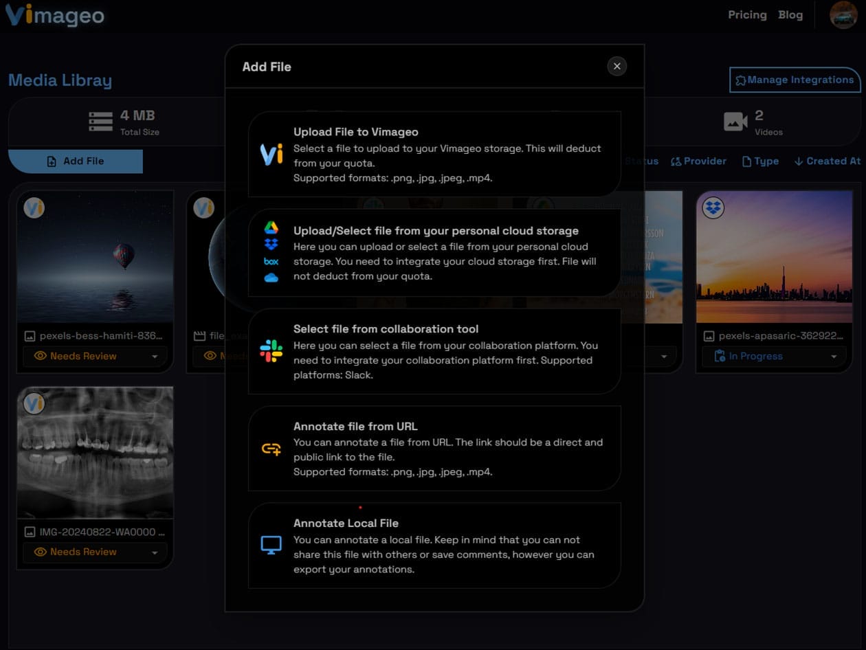 Upload files or connect external storage like Google Drive or Box, add timestamped video comments or image markups, and share instantly with clients or teammates. You can organize activity logs, and export annotations for documentation or review.