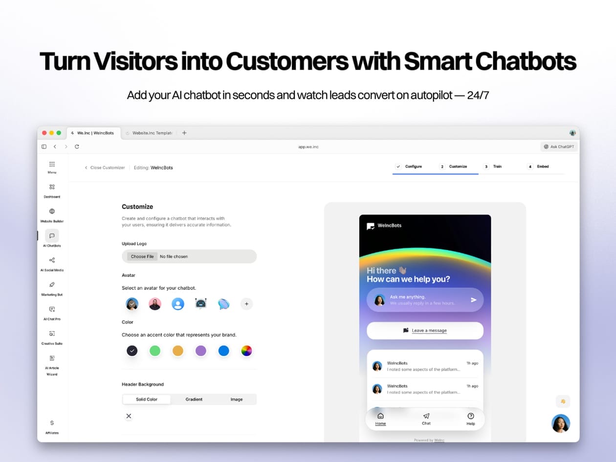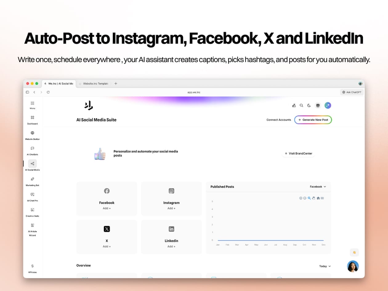 You can now build and launch your website without juggling multiple tools and spending too much on subscription fees. We.inc combines website building, AI chatbots, social media scheduling, marketing automation, and content tools into one simple platform. With the power of AI, We.inc lets you create your website with no coding experience required. We.inc is your one-stop solution, offering over 280 templates, smooth & fast hosting, and seamless integration with leading software. Say goodbye to extra work and get everything you need with We.inc.