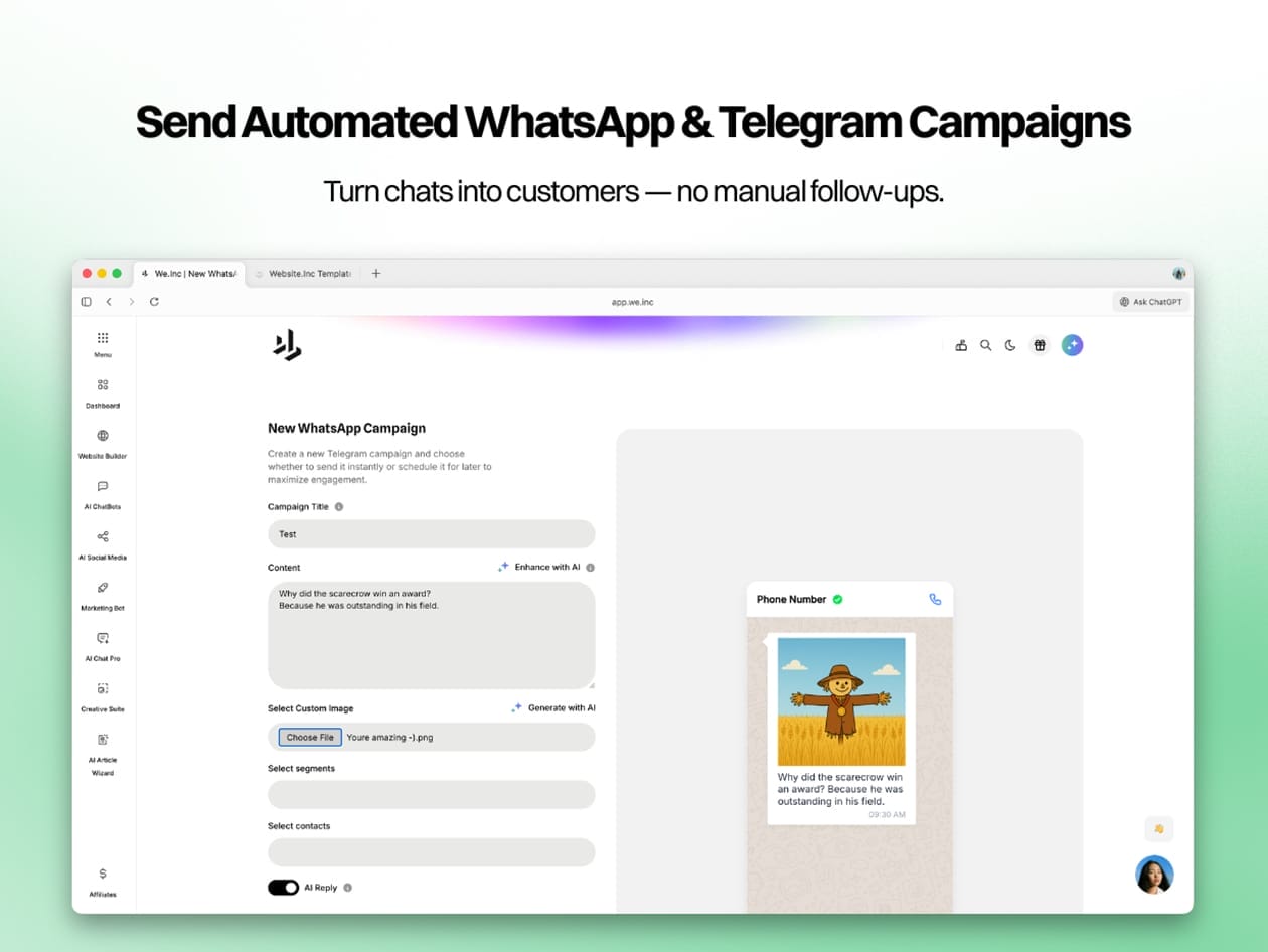 Sales Automation: Use AI chatbots & marketing flows to convert visitors into paying customers.